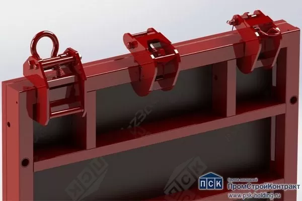 Зажима: литой элемент, расположенный на соединительной оси корпуса, находится в свободном вращении в рамках заданного диапазона. Зажим фиксирует раму щита в корпусе крюка.