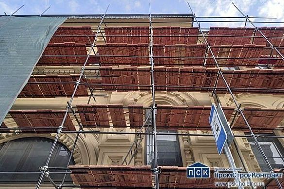 Леса стоечные приставные хомутовые (они же - ЛСПХ), производимые на современном роботизированном оборудовании на заводе ГК ПСК, предназначены для отделочных работ стен зданий, могут применяться для зданий сложной конфигурации как в плане, так и по высоте, а также при наклонных основаниях. Конструкция лесов позволяет в широких пределах изменять схемы каркаса (шаг стоек, высоту яруса) в зависимости от очертания зданий. Это даёт возможность использовать хомутовые леса на строительных площадках со значительными перепадами уровня установки конструкции, например при сложных архитектурных формах или на холмистой местности. Среди примеров в портфолио ПСК: комплексная реконструкция Средних Торговых Рядов на Красной площади Москвы, после которой данный объект  площадью более 85 000 квадратных метров (для приемки в будущем коллекций Музея Кремля. Опыт данного объекта показывает, что даже очень крупные комплекты таких лесов могут быть собраны в считанные дни. Хомутовые строительные леса по мнению многих строителей оптимальны для простого ремонтных работ фасадов зданий нестандартной формы. Также данные конструкции часто применяются на купольных сооружениях (например, при строительстве и реконструкции храмов), на зданиях с закругленными стенами.